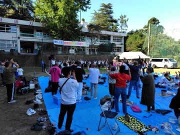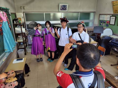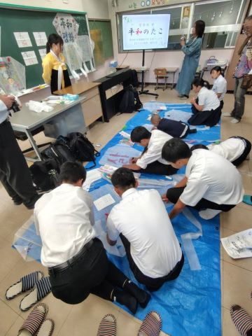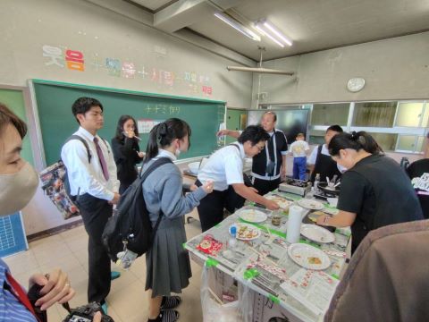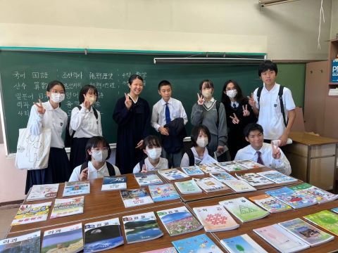 受付をすませて、まずは授業参観。今年は、小中生合わせて全校児童生徒8人のささやかな授業ですが、凧作りをしていたり、チヂミづくりをしていたり、地理の授業が行われたりと、あたたかい雰囲気で行われていました。どの授業も基本はハングルで行われています。教室の掲示物も教科書も、ほぼハングルです。私たちには分かりません。でも、学習している内容は、私たちと何も変わらないものでした。