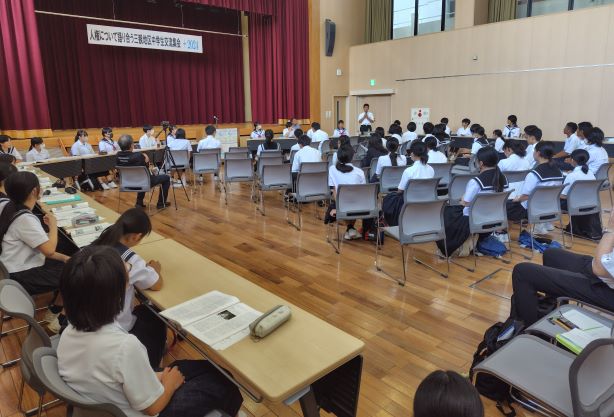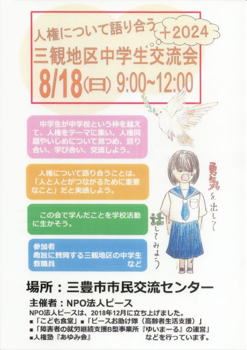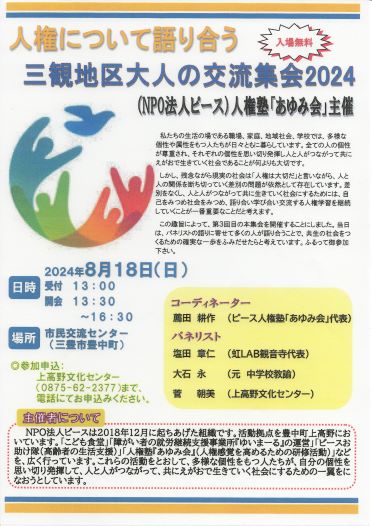 8月18日(日)、香川県の三観地区(三豊市・観音寺市)の中学生を集めての集会「人権について語り合う三観地区中学生交流集会」と、大人を集めての集会「大人の交流集会」が三豊市市民交流センターで開かれ、森口・吉成とこども塾の高校生3人で行ってきました。