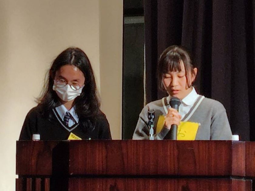 「去年は塾生だった。行かねばならないと思って来た。先生から誘われて入った。1年生のとき、人権作文はLGBTQ+を書いた。まさか自分が選ばれるとは思ってなかった。拙かったのに発表して、選んでくれて嬉しかった。学年でも褒められてうれしかった。人権学習が楽しいって思った。」