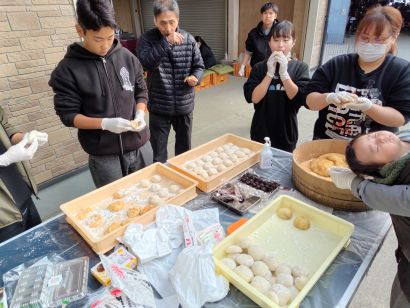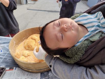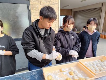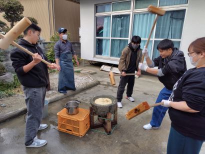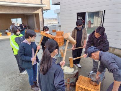 そして、恒例の新春餅つき大会! なんと、餅をつくのが初めての中学生も!