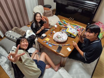 千羽鶴の最後の制作です。合計、約三千羽が集まり、3つの「ほぼ千羽鶴」が完成しました!すごい!