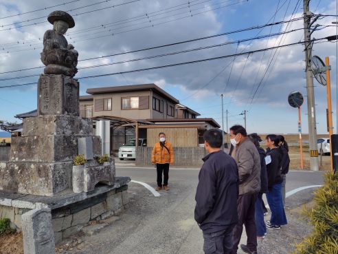 奥に見える堤防は、「日本三大暴れ川」と言われた四国三郎・吉野川の堤防です。現在の堤防ができる前の吉野川の流れは定まってなく、時代によってうねうねと流れを変える暴れ川でした。この辺りも洪水が押し寄せ、何度も甚大な被害を出したと言われています。そのときの洪水を示すために作られたのが、この高地蔵です。酷いときには、お地蔵さんの蓮の葉のところまで水がきたと言われています。私たち大人の頭のはるか上ですね。