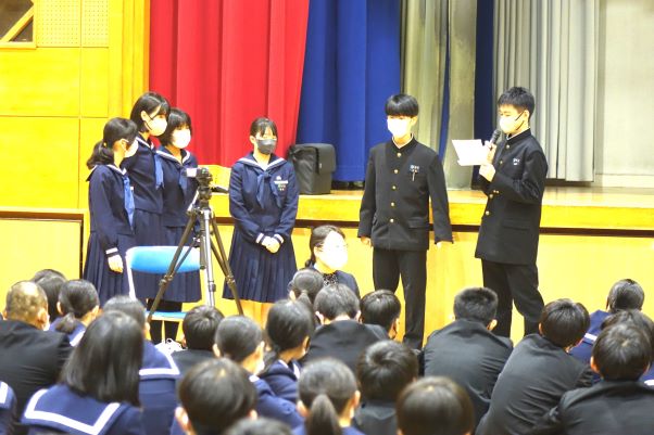 3-㊹悲しかったことを言うんですけど,中学校に入る前に,祖父が亡くなってしまって,厳しい人なんですけど,ちゃんとやさしいところもあって。でも厳しいところが多かったから仲良くできてなくて,できてませんでした。そんな祖父が,中学校の制服が見たいって言ってたんですけど,直前に亡くなってしまって,見せられなくて。お葬式の時に見せることになってしまって,それが悔しかったです。終わります。」