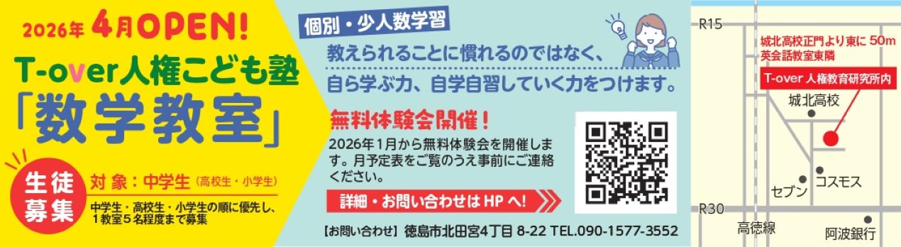 12月16日(火)付、徳島新聞の広報誌「リオ」(城西中校区)に、人権こども塾「数学教室」の広告を入れさせていただきました。自宅教室前の横断幕に続く第2弾です。誰か来てほしいです。
