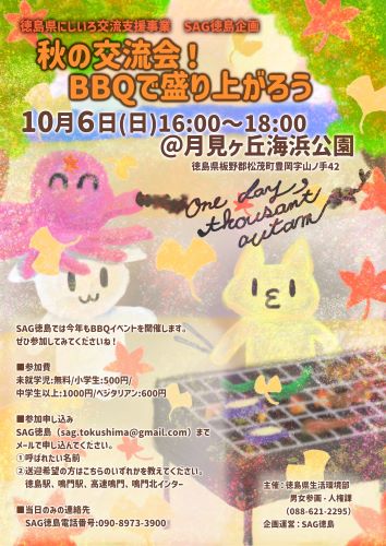 10月6日(日)16時から、松茂町月見ヶ丘海浜公園でSAG徳島による秋のBBQが開催され、人権こども塾の希望者も参加してきました。