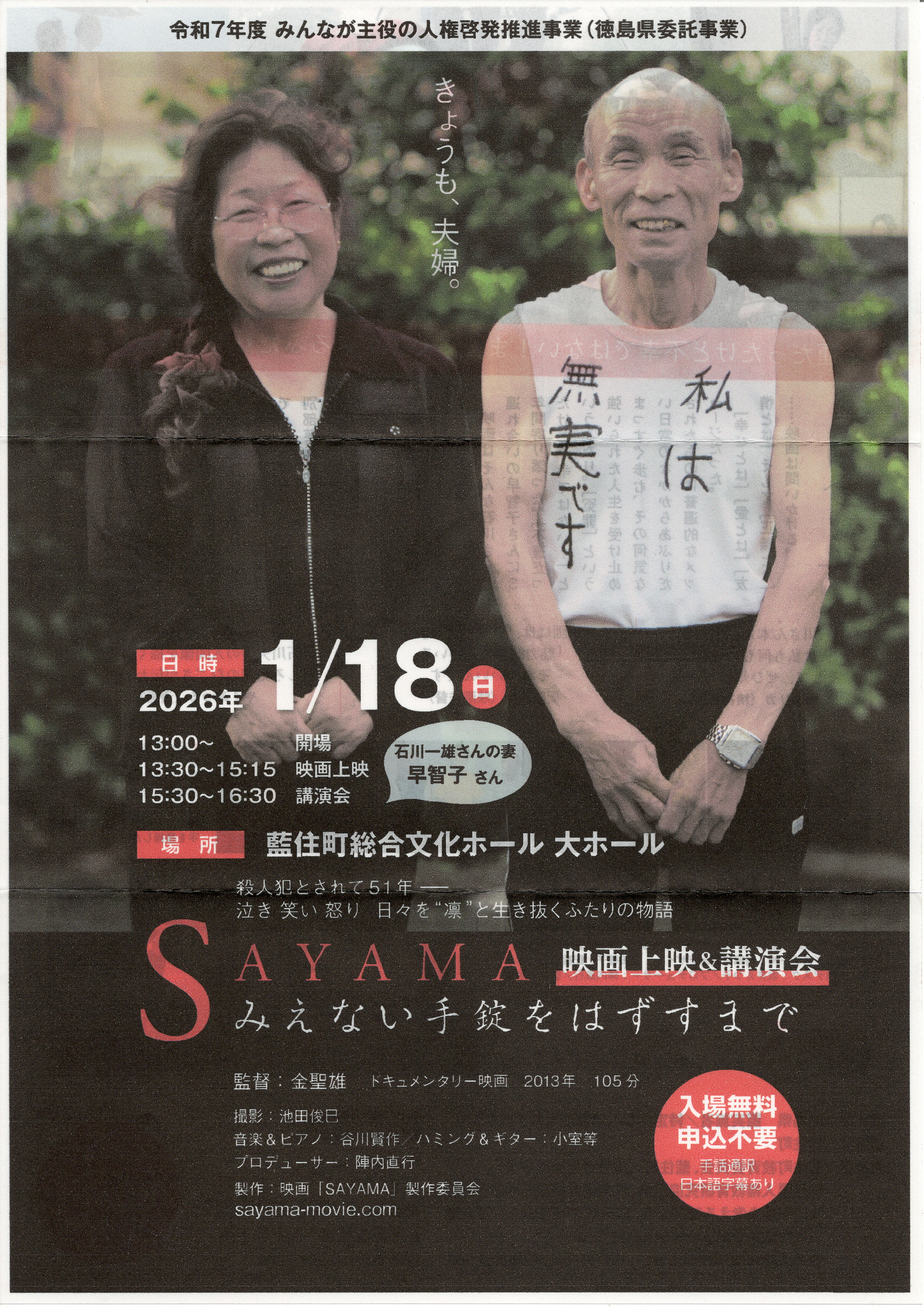 日時:2026年1月18日(日)13:30~15:15映画上映、15:30~16:30石川早智子さん講演会